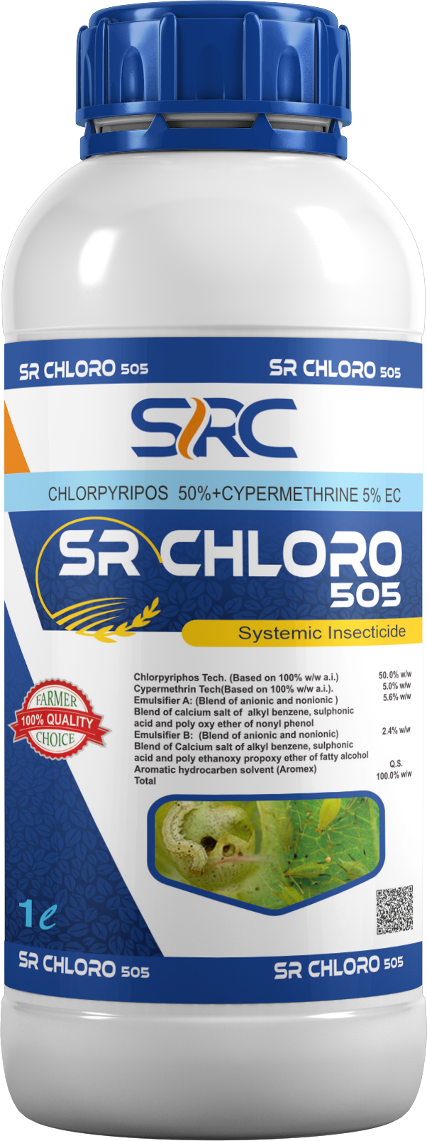 Chlorpyripos 50% Cypermethrine 5% EC It is a broad spectrum insecticide having contact and stomach action against pod borers, fruit borers, stem borers, leaf miners, defoliating caterpillars, sucking pests, termites etc., Combination results in synergistic action providing longer protection.