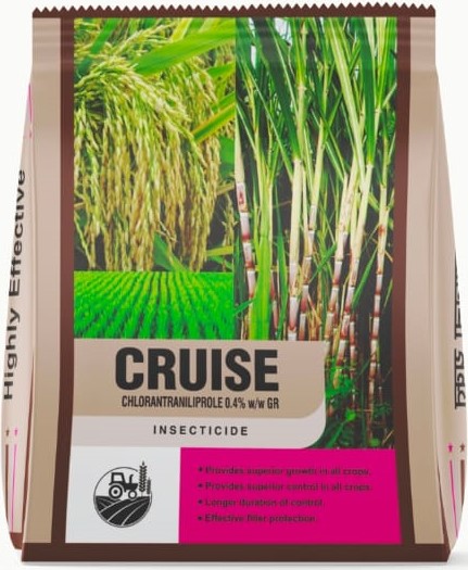 Chlorantraniliprole 0.4% W/W GR Cruise is a chemical insecticide containing Chlorantraniliprole 0.4% in Granules formulation. It effectively controls a wide range of insect pests through systematic action. It disrupts the muscle cells of insects, which leads to paralysis and causes death of the insect. This pesticide control is suitable for agricultural use against pests such as Yellow stem borer,Leaf folder, Early shoot borer,Top borer in the crops like Paddy and Sugarcane crops.