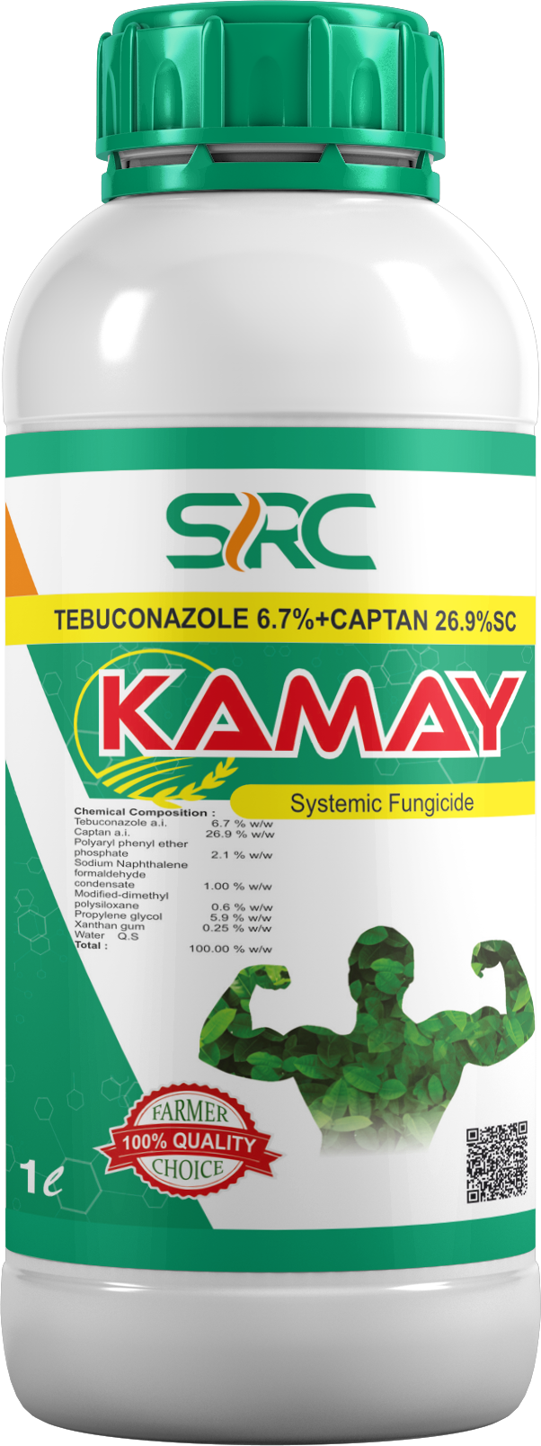 Tebuconazole 6.7% + Captan 26.9% SC It is a novel fungicide with dual mode of action that impacts multiple stages of fungal growth. Contact and Systemic fungicide with translaminar action.